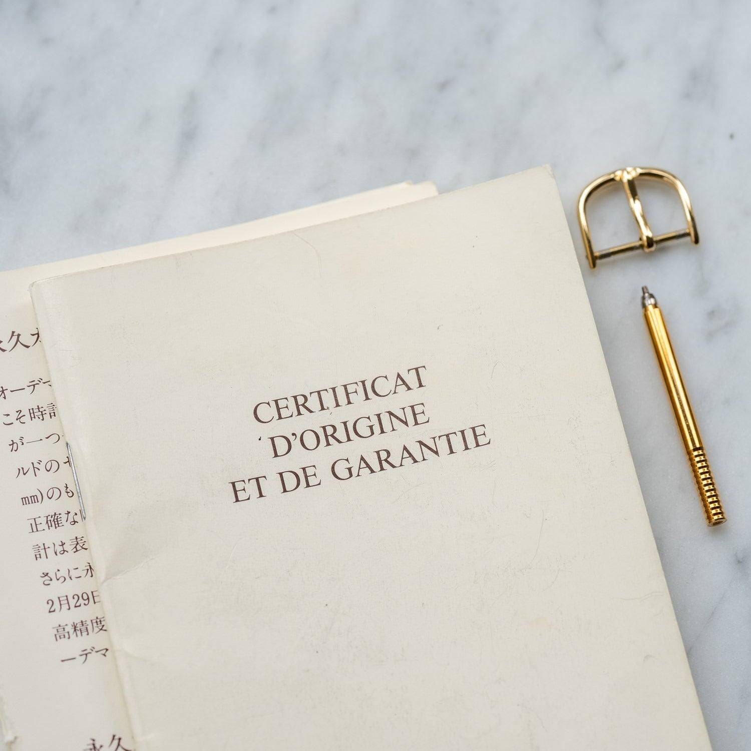 Certificate of Origin(Sold in 1987), AP Signed Yellow Gold Buckle, Calendar adjustment instruction in Japanese, AP Setting Pin for Calendar adjustment