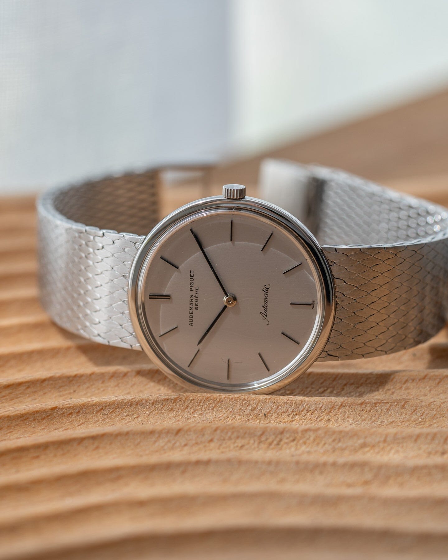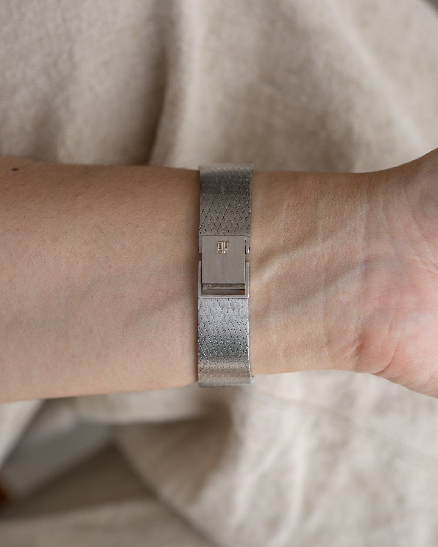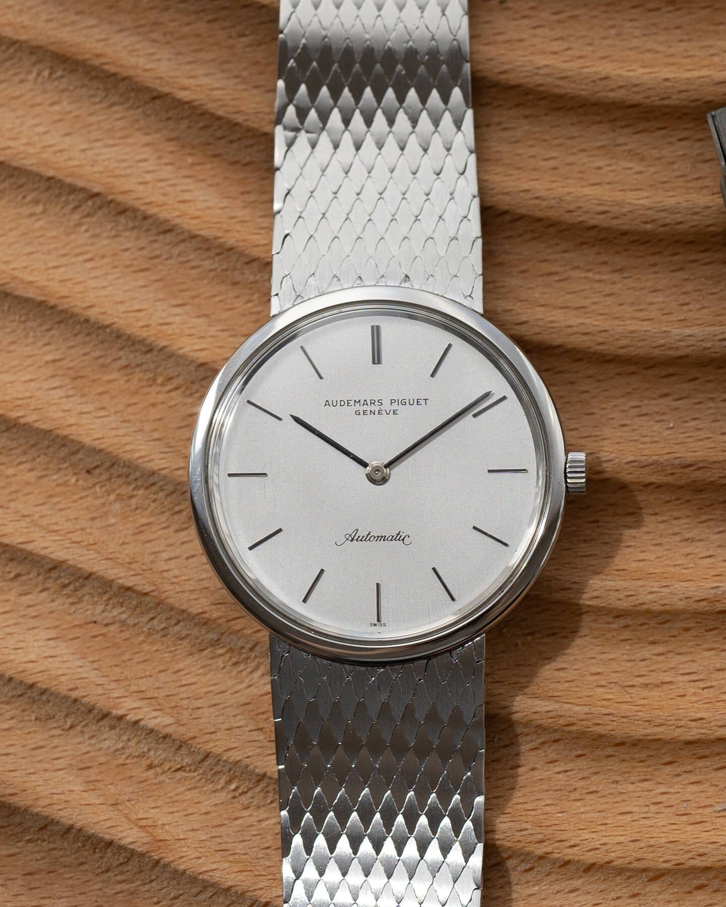The case is made of stainless steel, which is rare for an AP watch of this era, and has an integrated bracelet.