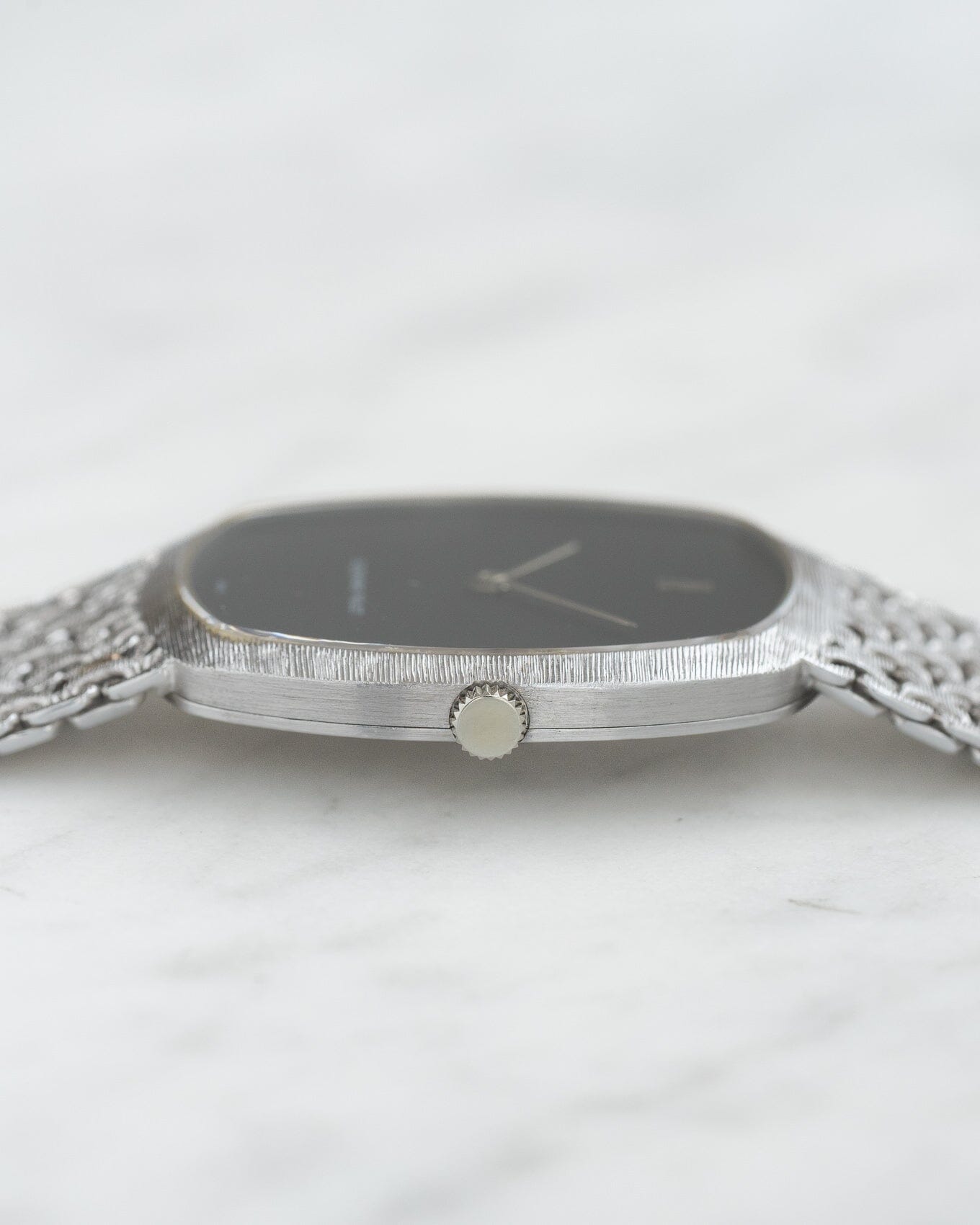 This watch is a manual wind, bracelet-integrated dress watch manufactured in the 1970s.