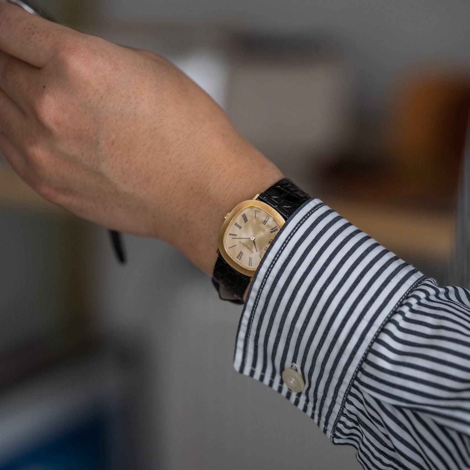 The case is made of 18K yellow gold, and the shape is neither a tonneau nor a rectangle, and I think it is the closest to the description of ellipse.