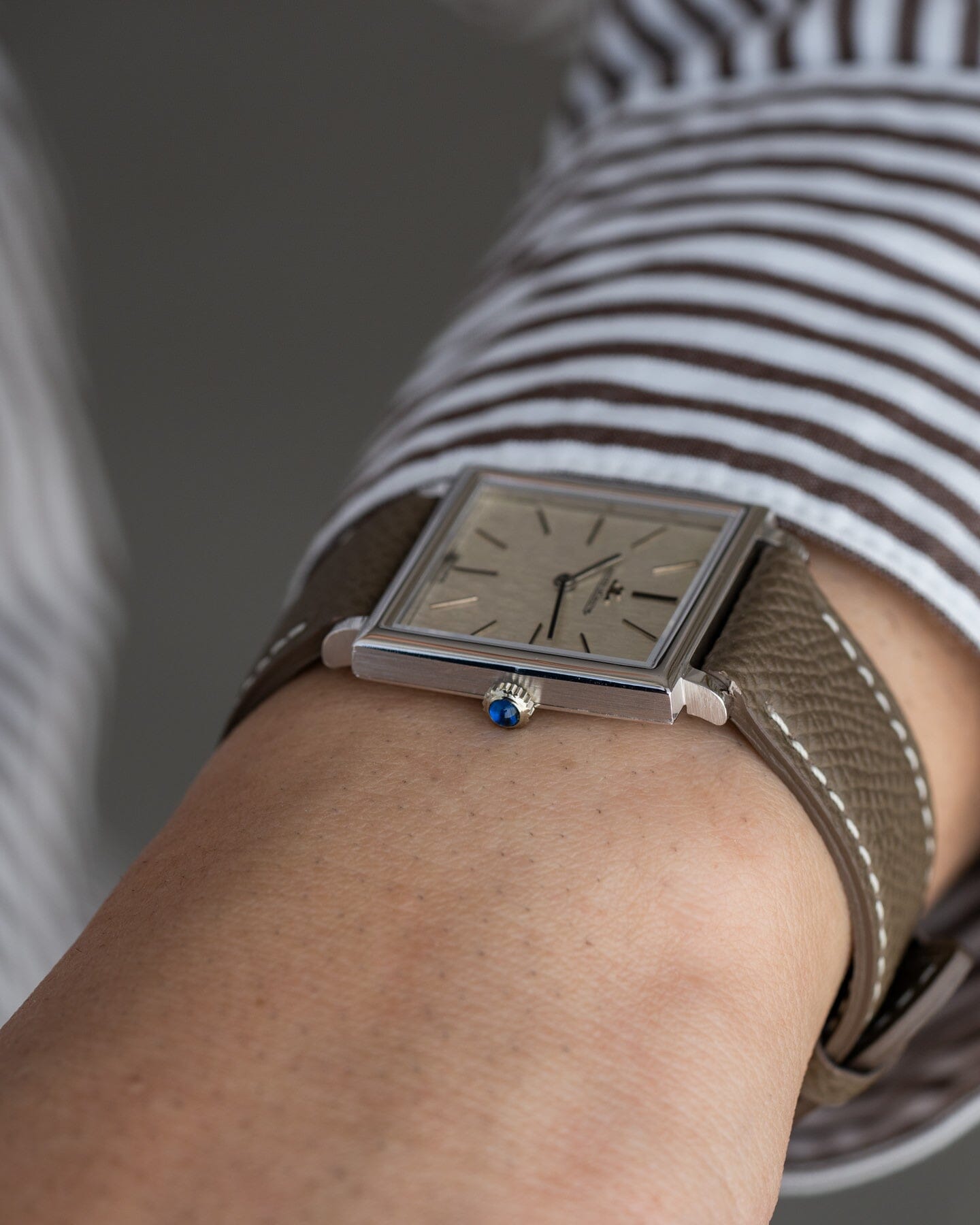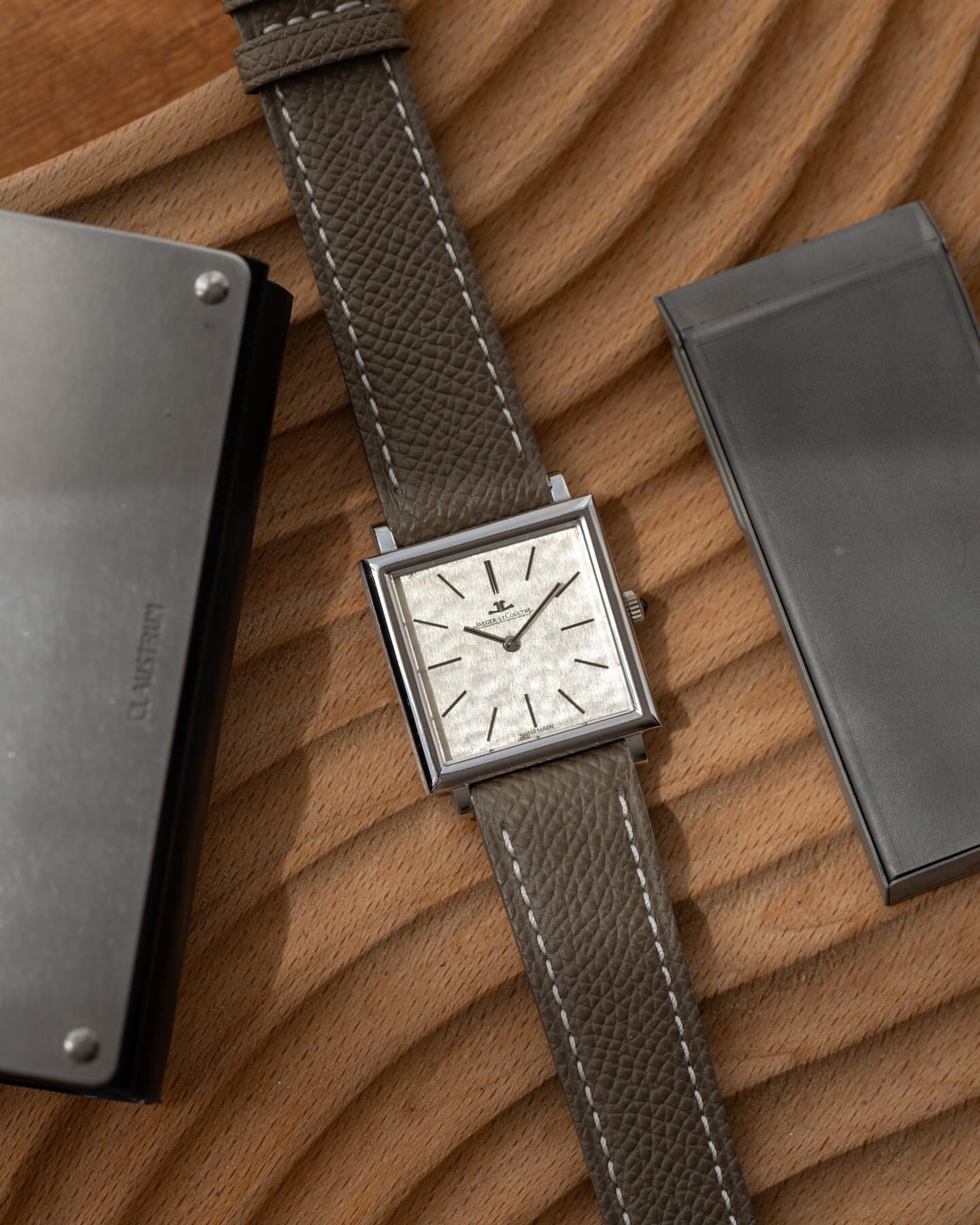 This watch Ref 4442 is a hand-wound dress watch with a square case and a snow patterned dial.