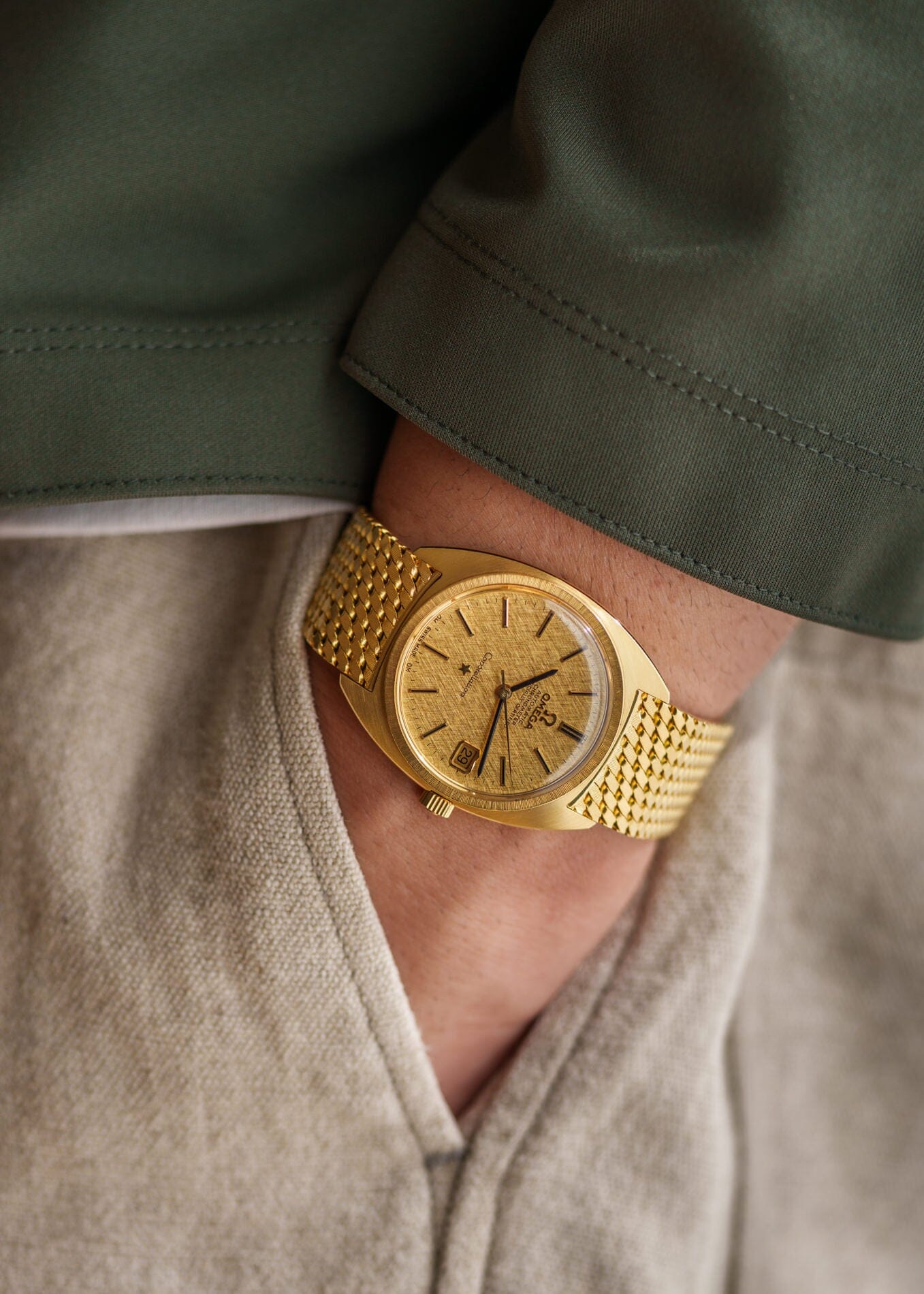 This Ref. 168.009/168.017 is a dress watch with an 18K yellow gold C-line case, a linen textured dial, and a braided yellow gold bracelet.