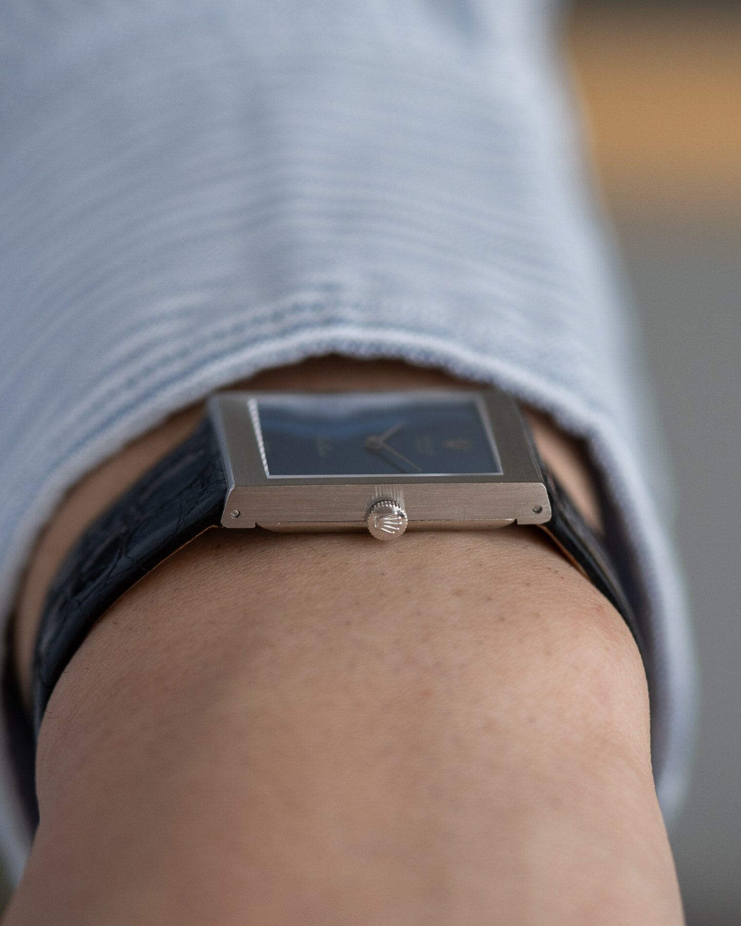 This reference 4014 is a vintage watch produced in the early 1970s. A major feature is the rectangular case that resembles a picture frame.