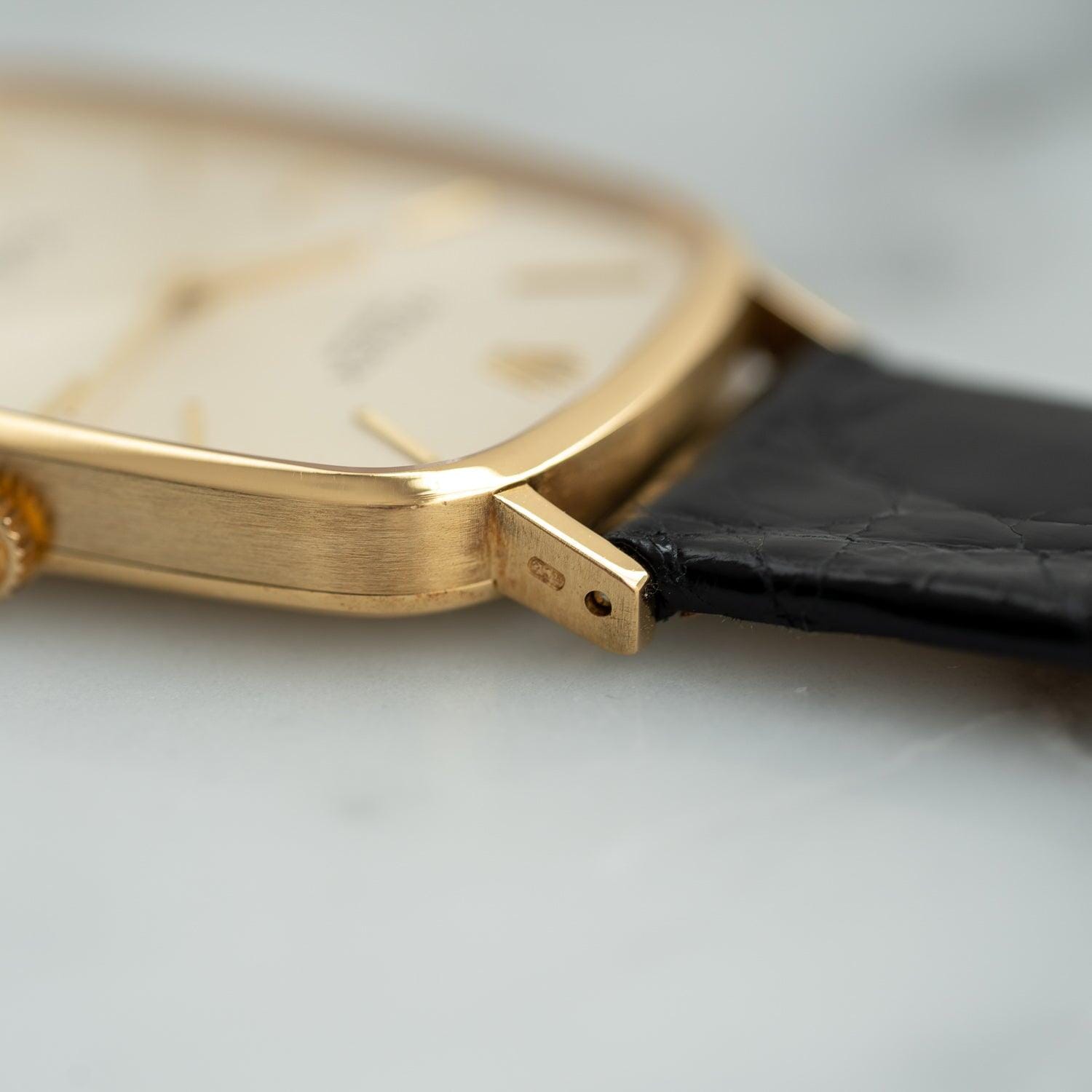 This reference 4113 is an 18K yellow gold watch with a rounded rectangular case.