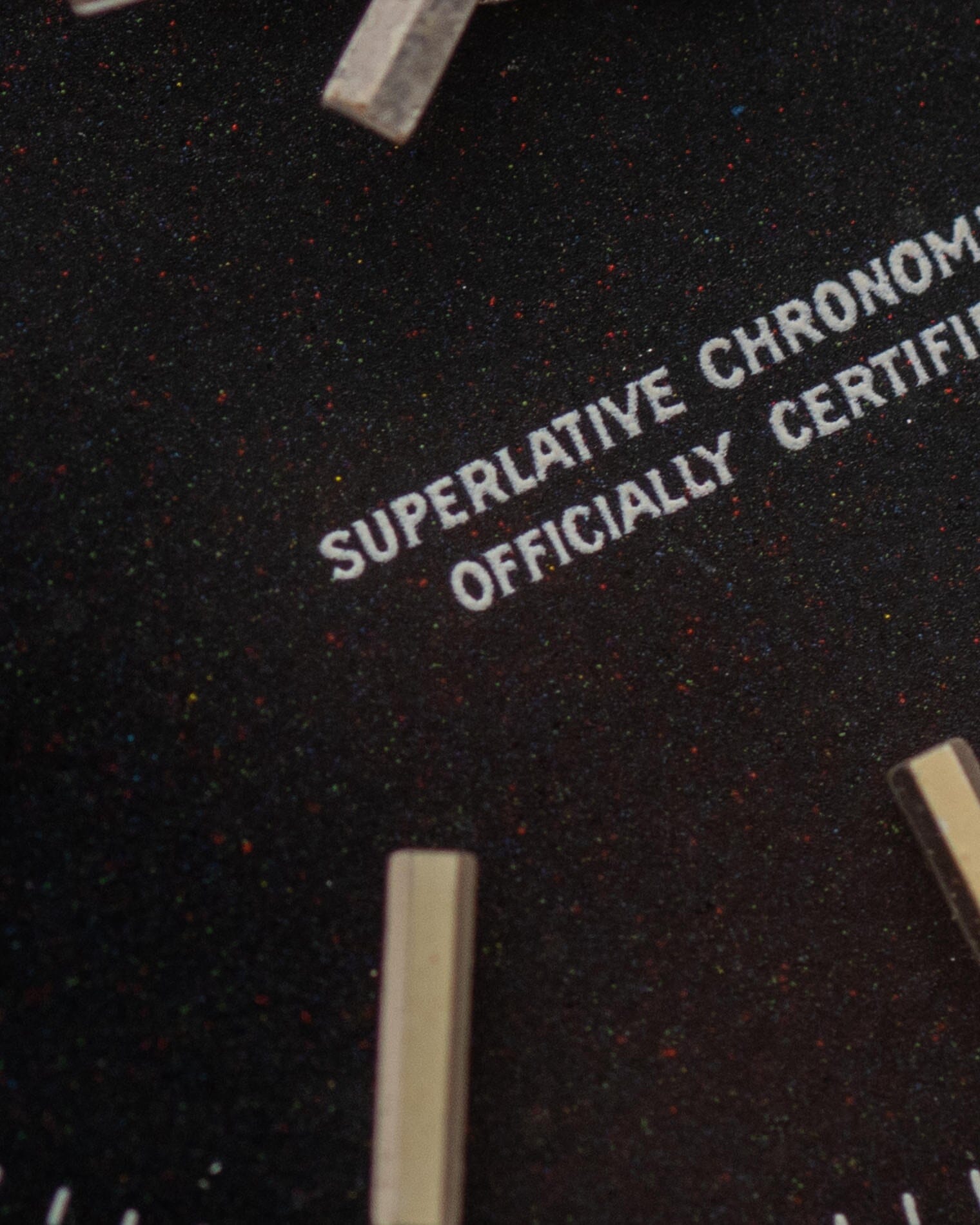 The dial is a matt black dial. This is one of the rarest dials, known as the 'confetti' dial, which was only produced for a few years. Under magnification, red, yellow and green paint particles can be seen in addition to the black ground colour.