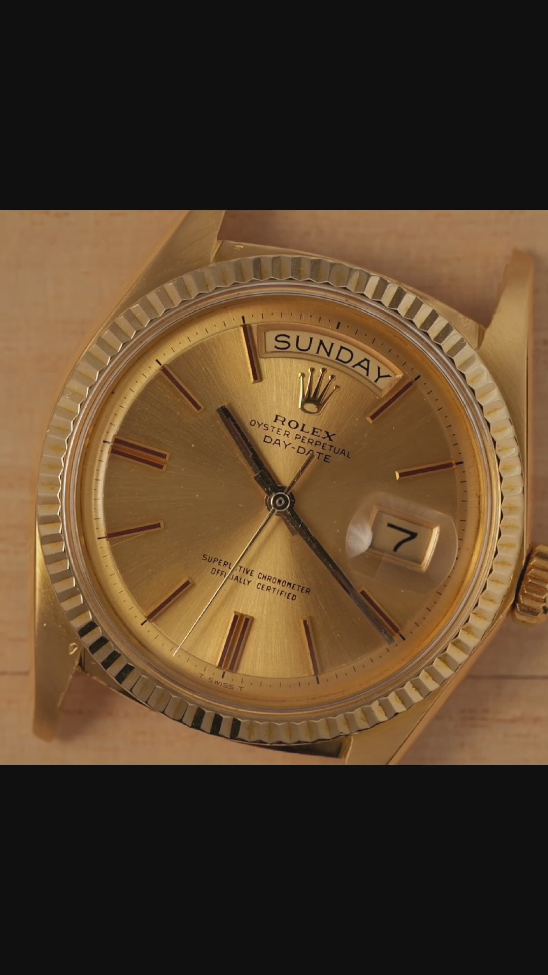 The luminous paint is applied only to the hands, but it has faded and become one piece. The condensed design with the outer edge of the dial lowered by one step and the raised plastic crystal are features unique to the vintage Day-Date with a four-digit reference.